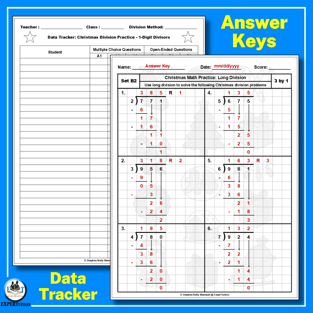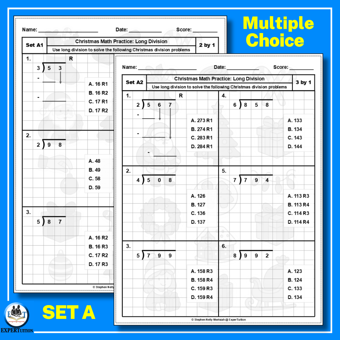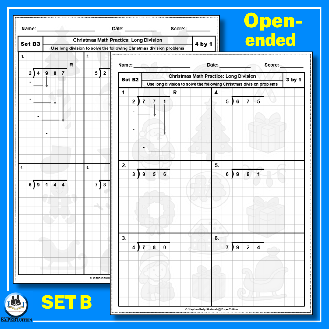 Practice long division with these Christmas math practice worksheets. This Christmas division practice covers 2-digit by 1-digit, 3-digit by 1-digit, and 4-digit by 1-digit division with and without remainders. The worksheets are presented in graph paper form, each with a Christmas background, and can be used for morning work, homework, warm-ups, and more.